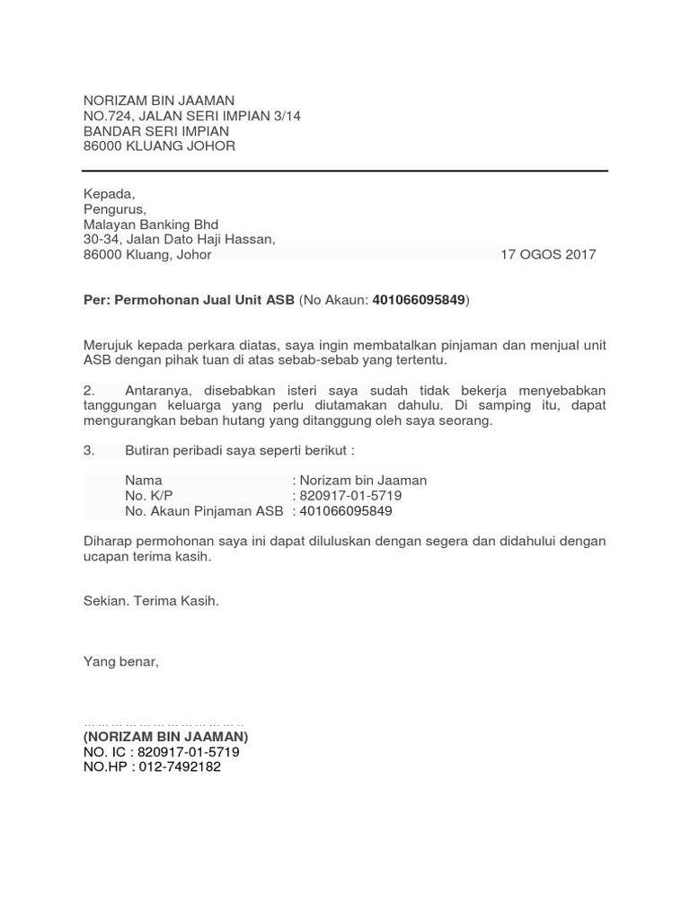 Sample letter asb loan cancellation. Berikut dikongsikan contoh surat kiriman rasmi beserta format buat panduan mereka yang memerlukannya termasuk ibu bapa dan pelajarSurat merupakan satu instrumen komunikasi konvensional yang masih digunakan secara meluas di Malaysia terutama surat kiriman rasmi. Cara Terminate ASB Loan Cancel Pinjaman Maybank CIMB RHB Dikhabarkan bahawa kadar dividen ASB 2020 ialah 55 sen sahaja.